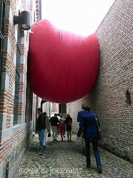 圖片四是活動期間會移來移去的大紅球,不知道Mons地上的紅色膠帶是不是就是為了尋找它而綿延在城市石頭路上。沿著膠帶走很有趣喔!一定要試看看。 😃