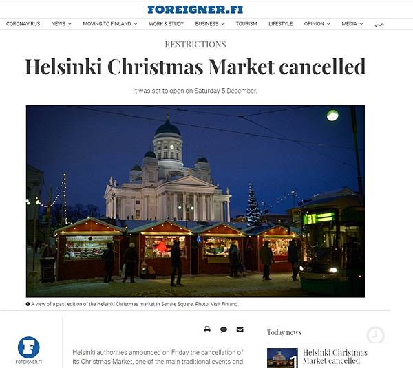 -原本預計在12月5號開始的赫爾辛基聖誕市集因為疫情的關係,今年就決定取消了。 (芬蘭文版)