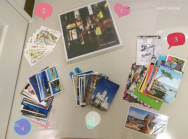 1是今天終於下定決心買的明信片本 2是台北旅遊服務中心的明信片們 3是準備跟別人交換的明信片們 4是每一個貼心的你們稍來的問候 ❤ 5是這兩年來我自己的足跡 真的很喜歡明信片,每一張都有好好保存喔! 🙂
