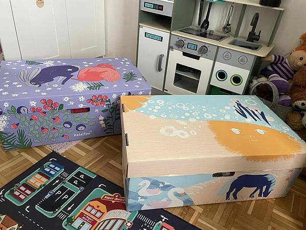 記得葡萄乾時期,我們回赫爾辛基找公婆的時候都會帶著蓋子和墊子當嬰兒床。現在則是拿來當置物盒,放兩個孩子穿不下的衣服。