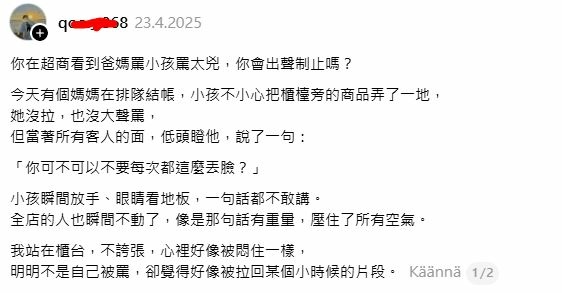 這兩次回台灣,我都有遇到至少一次讓我渾身不適的狀況,那就是「路人『非常大聲』地管教小孩」